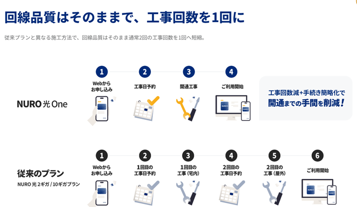 NURO光の導入にあたって、これまでは宅内工事と宅外工事の2回に分けて実施するケースが一般的でしたが、新プランや施工方式の改善により、**1回の工事で開通作業が完了するケースが増えています**。この一本化は日程調整の負担を軽くし、申し込みから利用開始までの期間を短縮する効果が期待できます。申し込み前に「今回の申し込みで1回工事が適用されるか」を確認しておくと安心です。