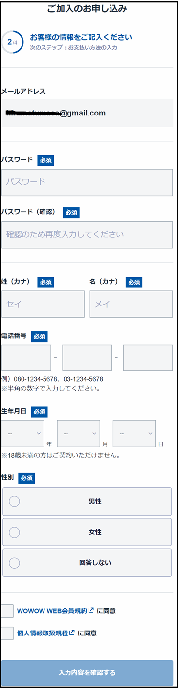 入力後、二つの同意箇所にチェックして「入力内容を確認する」ボタンをクリック。