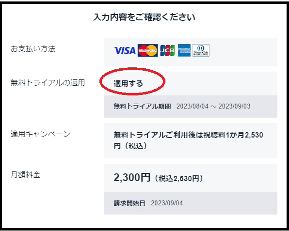 「する」を選べば、初月無料になります。その代わり、「無料トライアル対象外番組」は見れません。