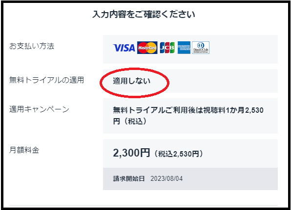 「しない」を選ぶと、その時点で視聴料金が発生しますが、「無料トライアル対象外番組」も見れます。