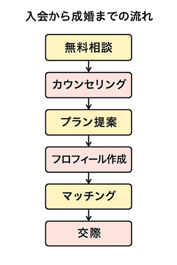 - 入会から成婚までの流れは、無料相談から始まり、カウンセリング、プロフィール作成、マッチング、交際、成婚となります