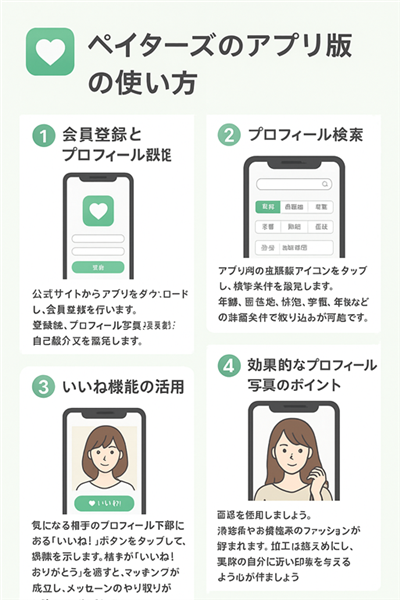 - 登録後は「いいね」でマッチングしメッセージ交換が可能になる