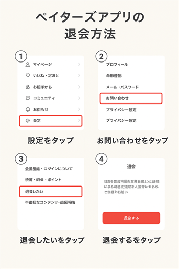 アプリ版での退会手続きは、まずアプリを起動してマイページから設定画面に進むところから始まります。設定内の「退会手続き」を選択すると、退会に関する詳細な注意事項や確認画面が表示されます。画面の指示に沿って操作を進めることで、スムーズに退会手続きを完了させることが可能です。